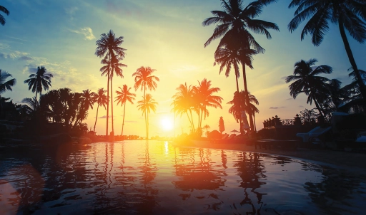 Palm pool, jacuzzi, café, and zen garden.